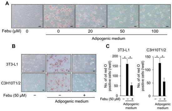 Febuxostat is a xanthine oxidase (XO) inhibitor that has been used in clinical practice for the treatment of hyperuricemia and gout [18]. Febuxostat effectively inhibits ROS formation [19]. We previously reported that febuxostat inhibits the receptor activator of NFκB ligand (RANKL)-mediated osteoclastogenesis by suppressing ROS production in osteoclast progenitors and alleviating bone loss in ovariectomized mice [20]. The anticancer agent doxorubicin enhanced RANKL-induced ROS production and osteoclastogenesis, which were abolished by febuxostat. These results suggest that XOR inhibition by febuxostat can ameliorate XOR-mediated ROS overproduction under pathological conditions. In addition, the antioxidant N-acetylcysteine (NAC) suppresses adipocyte differentiation by decreasing ROS [21,22,23], suggesting a critical role for ROS in adipocyte differentiation [24].