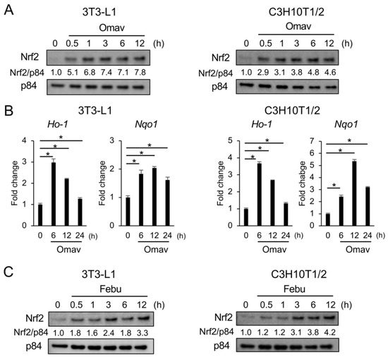 Our results suggest that the inhibition of XO by febuxostat suppresses adipocyte differentiation by inhibiting XO-mediated ROS production. However, the relationship between febuxostat and Nrf2 activation has not been studied. Therefore, we examined the nuclear localization of Nrf2 in 3T3-L1 and C3H10T1/2 cells after treatment with febuxostat. The addition of omaveloxolone immediately increased the nuclear localization of Nrf2 within 1 h in 3T3-L1 and C3H10T1/2 cells (Figure 6A,B). Notably, the addition of febuxostat similarly promoted the nuclear localization of Nrf2 within 1 h, followed by the upregulation of Nrf2 target antioxidant genes, including Ho-1 and Nqo1, in 3T3-L1 and C3H10T1/2 cells (Figure 6C,D), suggesting that febuxostat has potential as an Nrf2 activator. Intriguingly, Nrf2 activation with nuclear translocation was not induced by allopurinol (Figure 6E), another XO inhibitor. Therefore, febuxostat-induced Nrf2 activation appears to be independent of the XOR pathway.
