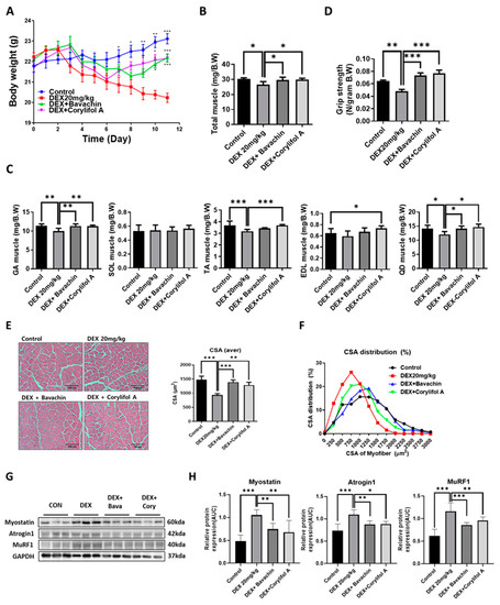 Bavachin (10 mg/kg) or corylifol A (10 mg/kg) was orally administered for 12 d, starting two days prior to DEX administration. (A) Body weight changes in mice and (B) total muscle weight. (C) Muscle weights of the gastrocnemius (GA), soleus (SOL), tibialis anterior (TA), extensor digitorum longus (EDL), and quadriceps femoris (QD) muscles. (D) Grip strength. (E) Representative images of the cross-sectional area (CSA) in the GA muscle tissue at 200× magnification. Average CSA of muscle fibers. (F) CSA distribution of the muscle fibers. CSA data were measured using the ImageJ software. Protein expression levels in GA muscles were determined via western blotting. (G) Representative images of the atrophic muscle factors. (H) Protein expression levels of the atrophic muscle factors. All data are represented as the mean ± standard error of the mean (S.E.M)., n = 6/group; * p < 0.05, ** p < 0.01, *** p < 0.001; nonparametric analysis of variance, followed by Kruskal-Wallis test.