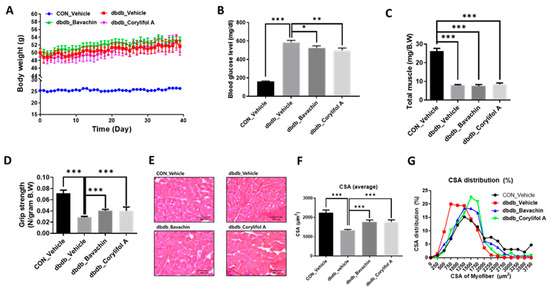 Bavachin and corylifol A increase the muscle strength in diabetic (db/db) mice. Twelve week old male db/db mice were administered bavachin (10 mg/kg) or corylifol A (10 mg/kg) for 40 d. (A) Body weight changes in mice, and (B) non-fasting blood glucose levels. (C) Total muscle weight. (D) Grip strength. (E) Representative images of CSA of GA muscle tissue at 200× magnification. (F) Average CSA of muscle fibers. (G) CSA distribution of muscle fibers. CSA data were measured using the ImageJ software. All data are represented as the mean ± S.E.M., n = 6–7/group; * p < 0.05, ** p < 0.01, *** p < 0.001; nonparametric analysis of variance, followed by Kruskal-Wallis test.