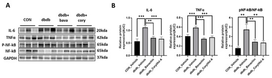 Bavachin and corylifol A suppress pro-inflammatory cytokine expression levels in db/db mice. Twelve week old male db/db mice were administered bavachin (10 mg/kg) or corylifol A (10 mg/kg) for 40 d. Protein expression levels in the GA muscle were determined using western blotting. (A) Representative images of western blotting. (B) Protein expression levels of inflammatory cytokines. All data are represented as the mean ± S.E.M., n = 6/group; ** p < 0.01, *** p < 0.001; nonparametric analysis of variance, followed by Kruskal-Wallis test.