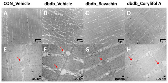 Bavachin and corylifol A improve the organization of muscle fibers and attenuate mitochondrial damage in skeletal muscles of db/db mice. Twelve week old male db/db mice were administered bavachin (10 mg/kg) or corylifol A (10 mg/kg) for 40 d. Transmission electron microscopy (TEM) of the GA muscle. (A,E) Control + vehicle, (B,F) db/db + vehicle, (C,G) db/db + bavachin, and (D,H) db/db + corylifol A groups. Red arrowheads indicate mitochondria. Images (A–D) were captured at 8000× magnification, and (E,F) at 20,000× magnification.