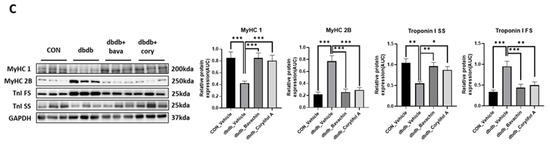 To further determine whether bavachin or corylifol A administration induces the conversion of glycolytic fibers into oxidative fibers in db/db mice, we analyzed GA muscle cryosections for myosin heavy chain (MyHC) isoforms type I, 2A, and 2B via multicolor staining (Figure 6). In db/db mice, while MyHC I and 2A expression levels were decreased, MyHC 2B expression levels were significantly increased compared with those in the control mice (Figure 6A,B). In contrast, bavachin or corylifol A administration increased MyHC I and 2A expression to levels similar to those in the control mice (Figure 6A,B). Specifically, bavachin and corylifol A administration suppressed MyHC 2B expression in db/db mice (Figure 6A,B). Consistently, the protein expression levels of the MyHC isoform in GA muscle showed a similar trend to the staining pattern. Specifically, while the protein expression levels of MyHC I were significantly increased, those of MyHC 2B were decreased by bavachin or corylifol A treatment (Figure 6C). To further confirm the fiber-type transition, we determined the protein expression levels of troponin I fast skeletal muscle (TnI-FS) and troponin I slow skeletal muscle (TnI-SS) in GA muscles representing fast and slow fiber types, respectively. In db/db mice, TnI-FS protein expression levels were increased, but those of TnI-SS were decreased compared with those in the control mice (Figure 6C). This change in protein expression levels was reversed by the administration of bavachin or corylifol A (Figure 6C).