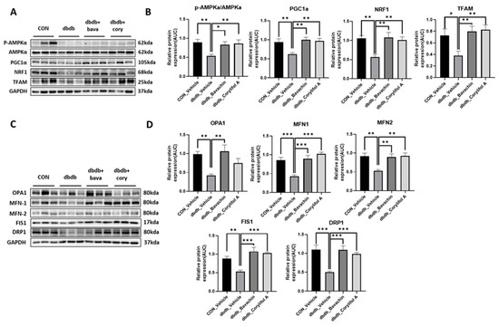 Mitochondria have a complex interconnected reticulum, and this structure is maintained by remodeling processes collectively known as mitochondrial quality control [10]. Mitochondrial biogenesis, fission, fusion, and mitophagy are key events in mitochondrial quality control [10]. PGC-1α is an expert regulator of mitochondrial biogenesis, and its expression is induced by exercise and chemical activation of AMPKα in the skeletal muscle [11]. AMPKα regulates transcription factors, such as NRF-1, CREB, MEF2, and PGC-1α by phosphorylation [50]. AMPKα regulates mitochondrial biogenesis through a PGC-1α-dependent mechanism [11,51]. Bavachin and corylifol A increased the phosphorylation of AMPKα, which was decreased in db/db mice, thereby increasing PGC-1α, NRF-1, and TFAM protein expression. These data indicate that bavachin and corylifol A may directly induce mitochondrial biogenesis via the AMPKα–PGC-1α signaling pathway targeting NRF1 and TFAM. Mitochondrial quality control mechanisms maintain mitochondrial function through selective fusion, fission, and mitophagy [52]. While OPA1 interacts with the mammalian mitofusins MFN1 and 2 to promote mitochondrial fusion [53,54,55], DRP1, and FIS1 promote mitochondrial fission [56]. In diabetic mice, MFN1/2, OPA1, DRP1, and FIS1 protein expression was significantly decreased compared with those in control mice. In contrast, bavachin and corylifol A administration reversed these effects.