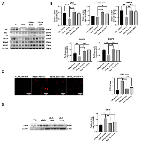 Mitophagy can cause aging and damage to mitochondria, which are important for the control of mitochondrial quality [37]. We analyzed the expression of proteins involved in autophagic processes. LC3 II is a marker of autophagosome formation, whereas p62 is a marker of autophagolysosome degradation. We found a significant decrease in p62 levels in db/db mice, whereas the expression levels of LC3 II were not changed in db/db mice (Figure 8A,B). Bavachin increased the expression levels of p62 and LC3 II, and corylifol A significantly increased the expression levels of p62 compared with those in db/db mice (Figure 8A,B). PINK1/Parkin-mediated pathway is one of the major mitophagy pathways in mammals [38]. Parkin and PINK1 protein expression levels were reduced in db/db mice. These effects were reversed by the administration of bavachin or corylifol A (Figure 8A,B). Mitophagy can also occur via parkin independent pathways. Levels of BNIP3, a biomarker of the parkin independent pathway, were decreased in db/db mice, but increased by the administration of bavachin or corylifol A (Figure 8A,B). These results suggest that both mediated mitophagy pathways were activated by bavachin and corylifol A. Consistently, ROS production levels from failed mitochondrial quality control were significantly elevated in db/db mice, as confirmed by bright positive areas (Figure 8C) and increased 4HNE levels (Figure 8D). Conversely, bavachin and corylifol A administration decreased DHE fluorescence brightness and 4HNE protein levels (Figure 8C,D).