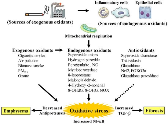 Although chronic obstructive pulmonary disease (COPD) is simply diagnosed based on persistent air flow limitation that will not return to the normal range, using spirometric measurements, this disease is heterogenous and complex in symptoms, disease progression, lung function and response to therapies [1]. The pathogenesis of this disease results from chronic lung inflammation due to cigarette smoke and other environmental exposures (biomass fuel etc.); and this chronic inflammation is associated with activation not only of neutrophils and macrophages but also of eosinophils. While these responses to lung inflammation are normal in many healthy subjects, in contrast, the response is potentiated in patients who develop COPD. This chronic lung inflammation affects distal airways, leading to emphysema and small airway fibrosis (pathological characteristics of this disease) [2,3]; and these pathological alterations in COPD are progressive in most cases [1]. The mechanisms of this modified inflammation are not understood well. Moreover, a wide variety of inflammatory mediators are related to this chronic lung inflammation. For this reason, specific treatment for inflammation is not well established in this disease. Oxidative stress is defined as a state in which oxidation exceeds the capacity of antioxidant systems in the body secondary to a loss of the balance between them. Disturbances in the normal redox state of cells can cause toxic effects through the production of peroxides and free radicals that damage all components of the cell, including proteins, lipids, and DNA. Oxidative stress from oxidative metabolism causes base damage, as well as strand breaks in DNA. Base damage is mostly indirect and caused by reactive oxygen species (ROS) generation, e.g., O2•− (superoxide anion radical), •OH (hydroxyl radical), H2O2 (hydrogen peroxide) and O3 (ozone) (Figure 1) [4]. Inflammatory cells as described above are recruited into the lungs in COPD [5]; and structural cells in the respiratory system (airway epithelial cells, fibroblasts, and endothelial cells) also contribute to the lung inflammation. These cells generate multiple mediators, including cytokines that perpetuate and amplify the inflammation in the lungs. These cells are also important sources of ROS, leading to oxidative stress in the lungs (Figure 1). Oxidative stress in the lungs due to exogenous oxidants (cigarette smoke, biomass fuel, air pollution) and endogenous oxidants (ROS generated by inflammatory cells, epithelium) are associated with clinical and pathophysiological characteristics of COPD (Figure 1) [6]. Mitochondrial respiration is an important source of ROS, and cigarette smoke produces excessive ROS via mitochondrial dysfunction (Figure 1) [7]. It is now generally considered that COPD results from an acceleration of lung ageing with the accumulation of senescent cells [8,9,10]. Senescent cells secrete high levels of inflammatory cytokines, immune modulators, growth factors, and proteases, referred to as senescence-associated secretory phenotype (SASP) [10]. This phenotype change is perhaps an essential mechanism in the chronic lung inflammation of COPD [11]. Since senescent cells also release ROS more than intact cells, this chronic lung inflammation potentiates oxidative stress in COPD (Figure 2). Therefore, oxidative stress is probably a major driving mechanism of many of the pathophysiological changes in COPD [12].