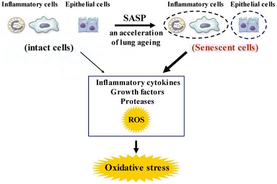 Roles of senescence in inflammatory and airway epithelial cells to enhance oxidative stress in COPD. These senescent cells in the lungs synthesize inflammatory cytokines, growth factors proteases, and ROS more than intact cells in them, referred to as senescence-associated secretary phenotype (SASP). These phenotype changes in these cells perhaps potentiate not only the lung inflammation but also oxidative stress in COPD. ROS: Reactive oxygen species.