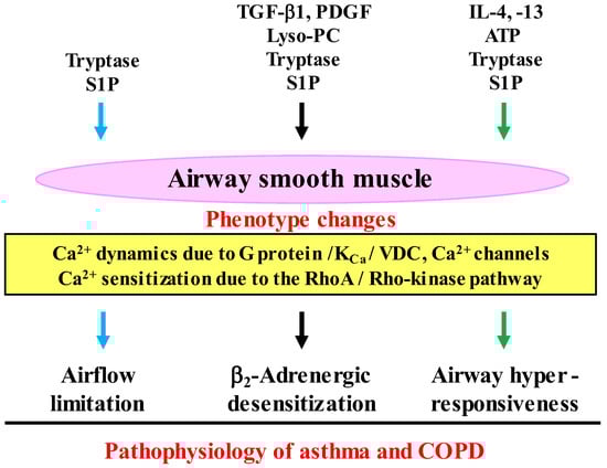 Airway smooth muscle cells in culture have the ability to change the degree of various functions such as contractility, proliferation, migration, and the synthesis of inflammatory mediators [50,51,52]. Alterations of airway smooth muscle cells from a contractile to a synthetic or a proliferative phenotype is involved in the pathophysiology of asthma and COPD, such as in airflow limitation, airway hyperresponsiveness, β2-adrenergic desensitization, and airway remodeling. These phenotype changes cause an abnormality in the function of airway smooth muscle. The dysfunction of airway smooth muscle occurs in asthma and COPD; and this phenomenon is associated with symptoms, a decline in lung function and the pathophysiology characterized by these diseases, and brings about contractile abnormality, release of inflammatory mediators, and hypertrophy in airway smooth muscle [53,54]. Airway smooth muscle cells can alter the degree of a variety of functions, including contraction, proliferation, migration, and the secretion of inflammatory mediators, referred to as phenotype plasticity. Characteristic features (major pathophysiology) of asthma and COPD, such as airflow limitation, airway hyperresponsiveness, β2-adrenergic desensitization, and airway remodeling, probably occur through phenotype changes in airway smooth muscle cells [50,51,52]. Changes between contractile and hyper-contractile, synthetic/proliferative phenotypes result from Ca2+ dynamics and Ca2+ sensitization, which are associated with the pathophysiology of these diseases [50,51,52]. Ca2+ dynamics through the large-conductance Ca2+-activated K+ (KCa) channel/L-type voltage dependent Ca2+ (VDC) channel linkage, and Ca2+ sensitization through the RhoA (a monomeric G protein)/Rho-kinase (a target molecule of RhoA) pathway is involved not only in alterations in the contractile phenotype related to airflow limitation, airway hyperresponsiveness and β2-adrenergic desensitization but also in alteration of the synthetic/proliferative phenotype related to airway remodeling [50,52].