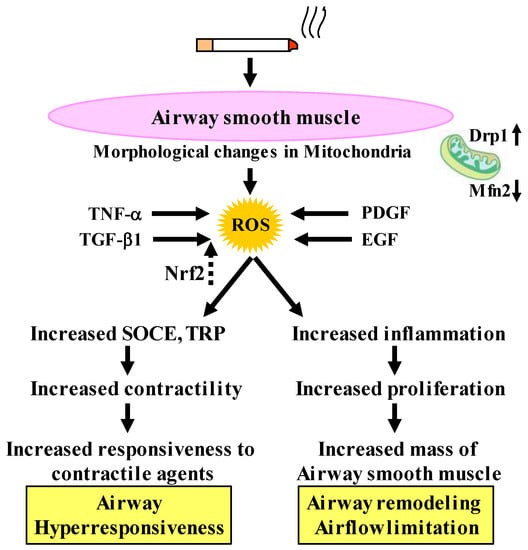 Cigarette smoke increases cell numbers in bovine tracheal smooth muscle with cyclin D1 expression and DNA synthesis via activation of ERK 1/2 and p38 MAP kinase [99]. Exposure to cigarette smoke also causes cell proliferation on rat airway smooth muscle with expression of transient receptor potential cation channel subfamily M member 7 (TRPM7) which is activated by ROS [100,101]. Cigarette smoke causes mitochondrial fragmentation and disruption of mitochondrial networks through imbalance of the mitochondrial fission versus fusion. This phenomenon is due to an increase in dynamin-related protein 1 (Drp1) expression (fission) and a decrease in mitofusin 2 (Mfn2) expression (fusion), involving PI3K/Akt, PKC and ERK activation and transcriptional regulation via NF-κB [7]. This morphological alteration in mitochondria (the imbalance of fission/fusion) is associated with mitochondrial function, and is involved in proliferation/survival, response to inflammation, extracellular matrix production, and Ca2+ regulation in airway smooth muscle cells [102]. Cigarette smoke may induce not only a contractile phenotype but also a proliferative phenotype of airway smooth muscle cells, which may be associated with airflow limitation, airway hyperresponsiveness and airway remodeling in COPD (Figure 4). Therefore, oxidative stress probably causes the dysfunction (phenotype changes) of airway smooth muscle cells with changes in mitochondrial morphology [7]. Growth factors, such as TGF-β1, PDGF and EGF (epidermal growth factor), contribute to increased cell proliferation and dysfunction of airway smooth muscle with ROS production in COPD [85].
