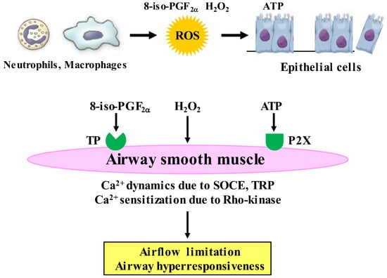 On the other hand, Y-27632, an inhibitor of Rho-kinase, inhibits H2O2- and 8-iso-PG2α-induced contraction without a reduction in F340/F380 in the fura-2 loaded tracheal smooth muscle of guinea pigs [91,92]. These results have demonstrated that Ca2+ sensitization (increased sensitivity to intracellular Ca2+) related to Rho-kinase is involved in the airway tension induced by oxidant stress in COPD (Figure 5). When a contractile agonist connects to the GPCR, RhoA (a monomeric G protein) is activated by a trimeric G protein coupled to the GPCR. Rho-kinase, which is a target molecule of RhoA, inactivates myosin phosphatase acting on myosin phosphatase target subunit 1 (MYPT1) [62], leading to Ca2+-independent contraction (Ca2+ sensitization) in airway smooth muscle. Ca2+ sensitization related to the RhoA/Rho-kinase pathway contributes not only to muscarinic contraction [125] but also to augmented response to muscarinic agonists [60,62,63], indicating that this Ca2+ sensitization is probably associated with symptoms (dyspnea, wheezing) and the pathophysiology (airflow limitation, airway hyperresponsiveness) in COPD. It is still unclear how oxidative stress induces airway epithelial disorder; however, ATP may be released from injured epithelium leading to the pathogenesis of COPD [126]. Extra-cellular ATP causes a modest increase in F340/F380 without contractile response; and muscarinic contraction is significantly enhanced without an increase in F340/F380 after exposure to ATP (Figure 5) [60]. Extracellular ATP acts on P2X (ATP-activated purinergic receptors, different from GPCRs), and contributes to symptoms (dyspnea, wheezing) and the pathophysiology (airflow limitation, airway hyperresponsiveness) via Ca2+ sensitization related to the RhoA/Rho-kinase processes (Figure 5) [60]. Since 8-iso-PGF2α acts on thromboxane receptors (GPCRs), oxidative stress due to 8-iso PGF2α causes airway contraction via d a monomeric G protein. On the other hand, intracellular mechanisms are still unknown as regards Ca2+ sensitization by H2O2 and ATP.