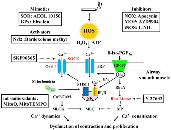 Chemical compounds that potentially act as antioxidants, and mechanisms (Ca2+ signaling) related to oxidative stress in COPD. The chemical compounds, which are mimetics of SOD, include: superoxide dismutase, GPx: glutathione peroxidase, activator of Nfr2: nuclear erythroid-2 related factor 2, inhibitors of NOX: NADPH oxidases, MOP: myeloperoxidase, iNOS: inducible nitric oxide synthase and mitochondria-related (mt)-related antioxidants; they are effective on oxidative stress related to COPD in animal models and vitro studies. Biomarkers of oxidative stress related to COPD (H2O2, 8-iso-PGF2α) and external ATP which are released from injured airway epithelium cause contraction of airway smooth muscle via Ca2+ dynamics due to SOCE and Ca2+ sensitization due to Rho-kinase. These Ca2+ signaling pathways are also associated with proliferation of airway smooth muscle cell, and are inhibited by SKF96365 and Y-27632, respectively. ROS: reactive oxygen species, TRP: transient receptor potential, SOCE: store-operated Ca2+ entry, STIM 1: stromal interaction molecule 1, CaM: calmodulin, MLCK: myosin light chain kinase: MP: myosin phosphatase, MLC: myosin light chain, IP3: inositol trisphosphate, IP3R: IP3 receptor, GPCR: G protein-coupled receptor. Arrows: activation; dotted arrows: inactivation.