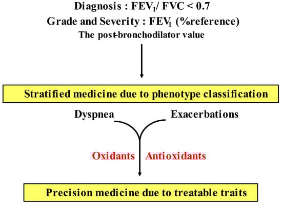 Precision medicine (personalized medicine) in COPD. The present guideline for COPD recommends that pharmacologic therapy for stable periods is carried out as a strategy based on symptoms (dyspnea) and frequency of exacerbations as treatable traits. Since COPD has heterogeneity, distinct phenotype classification is needed based on multidimensional approaches to advance from stratified medicine to personalized medicine in the management of COPD in near future. Although the clinical relevance of oxidative stress is still unclear, several oxidants can serve as treatable traits for development of precision medicine in COPD. See Section 6 in this text.