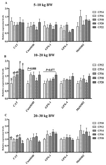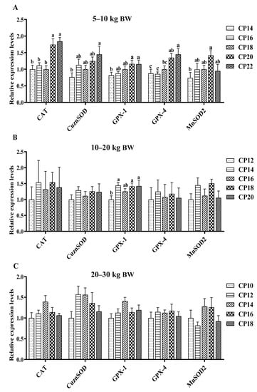Impacts of dietary crude protein (CP) levels on the oxidative stress-related gene expression in the jejunal mucosa of Huanjiang mini-pigs during the 5–10 kg (A), 10–20 kg (B), and 20–30 kg (C) BW stages. Data are represented as means ± SE (n = 6–8 per group). Different superscript letters indicate significant differences among the five groups (p < 0.05). CAT, catalase; CuznSOD, copper- and zinc-containing superoxide dismutase; GPX-1, glutathione peroxidase 1; GPX-4, glutathione peroxidase 4; MnSOD, manganese-containing superoxide dismutase.