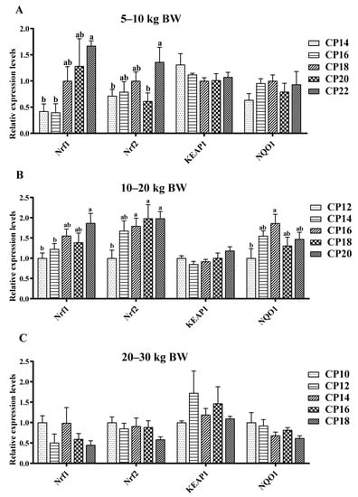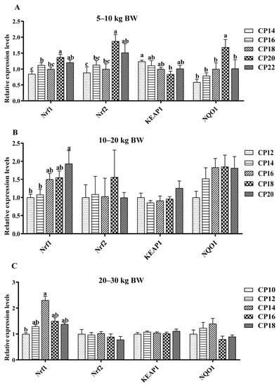 Impacts of dietary crude protein (CP) levels on the Nrf1/2-KEAP1-NQO1-related gene expressions in the ileal mucosa of Huanjiang mini-pigs during the 5–10 kg (A), 10–20 kg (B), and 20–30 kg (C) BW stages. Data are represented as means ± SE (n = 6–8 per group). Different superscript letters indicate significant differences among the five groups (p < 0.05). Nrf1, nuclear factor erythroid 2-related factor 1; Nrf2, nuclear factor erythroid-2 related factor 2; KEAP1, Kelch-like ECH associated protein 1; NQO1, nicotinamide adenine dinucleotide (phosphate).