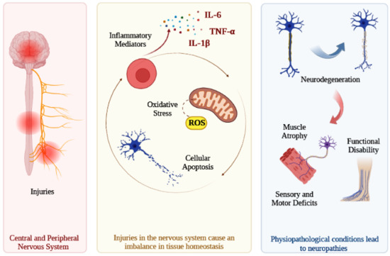 Figure 1. Injuries in the central or peripheral nervous system can lead to an increase in the synthesis of inflammatory cytokines, in the production of reactive oxygen species, and in cell apoptosis. These physiopathological alterations favor the degeneration of nervous cells, impair tissue regeneration, and compromise the recovery of neurological functions. Consequently, lesions in nervous tissue can cause complications of different degrees of severity, such as muscle atrophy, sensory and motor deficits, partial or total functional disability, and neuropathic pain. Interleukin-6 (IL-6); Tumor Necrosis Factor alpha (TNF-α); Interleukin-1 beta (IL-1β); Reactive Oxygen Species (ROS).