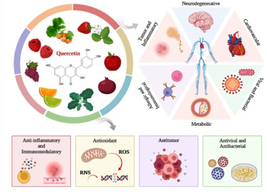Figure 2. Quercetin is a dietary flavonoid widely distributed among a diversity of fruits, vegetables, and medicinal plants. Quercetin has anti-inflammatory, antioxidant, antitumor, antiviral, antibacterial, and neuroprotective properties. Due to its properties, quercetin can exert beneficial biological activity, acting in the prevention of various pathologies, such as cancer, bacterial and viral infections, cardiovascular, neurodegenerative, inflammatory, immunological, and metabolic diseases. Reactive Nitrogen Species (RNS).