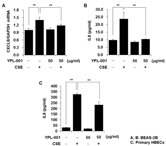 YPL-001 suppresses CSE-induced IL8 production. BEAS-2B cells were pretreated with YPL-001 for 2 h, then stimulated with CSE (1%) for 14 h (A) or 24 h (B) in the presence or absence of YPL-001. (C) Primary HBECs were pretreated with YPL-001 for 2 h, then stimulated with CSE (1%) for 24 h in the presence or absence of YPL-001. Quantitative real-time PCR for CXCL8 and GAPDH was performed (A). IL8 concentrations in the culture supernatants were determined by multiplex bead assay (B,C). Data are expressed as the mean ± SD of triplicates. ** p < 0.05. Results are representative of three separate experiments.