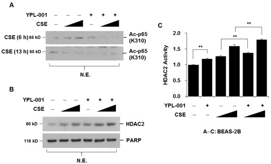 It has been reported that the acetylation of p65 at lysine 310 is required for full transcriptional activity of NF-κB [21]. CSE induced the acetylation of p65 (Lys310) 6 h after treatment, and acetylation returned to the basal level after 13 h. CSE-induced acetylation was completely abrogated by YPL-001 pretreatment (Figure 3A). HDACs remove acetyl moieties from the lysine residues of histones, causing rewinding of the DNA, which silences gene transcription [22]. Moreover, HDACs directly affect NF-κB nuclear binding [23,24]. Therefore, we determined whether the suppression of NF-κB activity by YPL-001 is related to changes in HDAC activity. Cells were pretreated with YPL-001 and stimulated with CSE. HDAC2 protein expression and activity were determined using nuclear extracts. We found that YPL-001 alone increased HDAC2 protein expression and HDAC2 activity. YPL-001 pretreatment enhanced CSE-induced HDAC2 expression and HDAC2 activity (Figure 3B,C). These results suggest that YPL-001 decreases acetylation of NF-κB, which might be mediated by increased HDAC2 activity.