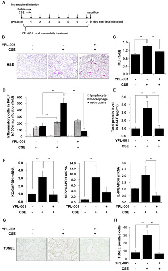 YPL-001 reduced CSE-induced emphysematous formation via multiple mechanisms such as anti-inflammatory and anti-apoptotic effects. (A) Experimental protocols for a murine model of emphysema. C57BL/6 mice were instilled intratracheally with saline or CSE. CSE was instilled once a week for 8 weeks (saline n = 6, CSE n = 5, YPL-001 + CSE n = 5). The mice were treated orally with YPL-001 (0.5 mg/20 g mouse) once daily for 8 weeks. The mice were sacrificed on day 1 after the last CSE instillation to collect lungs and BALF. (B) Representative images of H&E staining in lungs of mice (×100). (C) The mean linear intercept (MLI) was measured. Histogram bars represent mean ± SE. ** p < 0.05. (D) Differential cells in BALF were counted. Data are expressed as the mean ± SE. (E) Protein concentrations in BALF were measured. (F) Total RNA from the lung tissues of mice was isolated and quantitative real-time PCR for KC, MIP2, IL-6, and GAPDH was performed. Data are expressed as the mean ± SD. ** p < 0.05. (G) Representative images of TUNEL staining of lung tissue sections (×40). (H) Quantitation of the TUNEL-positive cells in lung tissues. Error bars represent mean ± SE. ** p < 0.05.