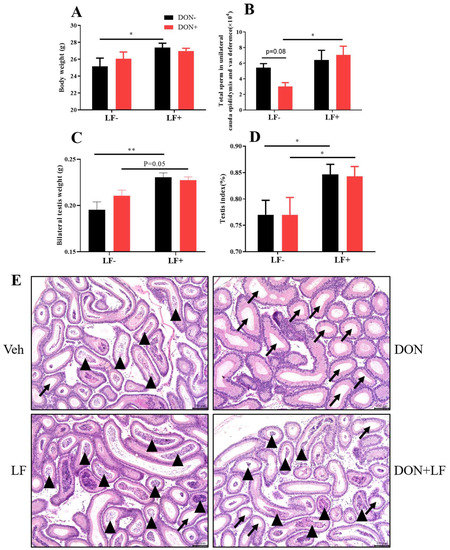 Effects of dietary DON and oral administration of LF on body and testis weight, and sperm count in the epididymis of mice. (A) Body weight. (B) Total sperm count in unilateral caput epididymis and vas deference. (C) Testis weight. (D) Index of the bilateral testis. (E) Cauda epididymis, histological, arrows indicated tubules with missing sperms and arrowheads indicated tubules with a cluster of sperm. Data were presented as mean ± SEM. For one-way ANOVA, * p < 0.05 and ** p < 0.01.