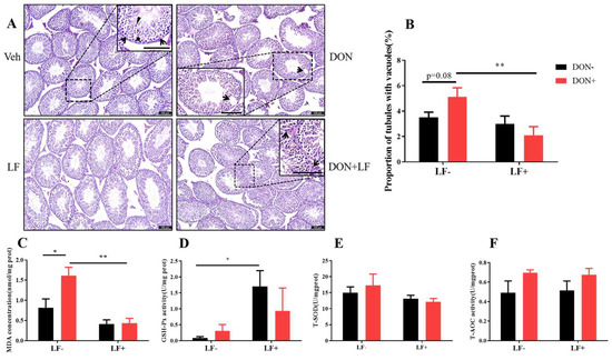 Effects of dietary DON and oral administration of LF on testis histological and oxidative status. (A) Testis histological, arrows point to Sertoli cells and the bold arrowhead indicates spermatids and well-developed spermatids with tail extended into the seminiferous tubule matrix (triangle) was observed (enlarged section in Veh); the arrow indicated vacuoles embedded in the epithelium (enlarged section in DON); arrows pointed to Leydig cells in the interstitial tissue of the testis (enlarged section in DON + LF). (B) The proportion of tubules with vacuoles. Testicular MDA concentration (C), GSH-Px activity (D), T-SOD activity (E) and T-AOC activity (F). Data were presented as mean ± SEM. For one-way ANOVA, * p < 0.05 and ** p < 0.01.