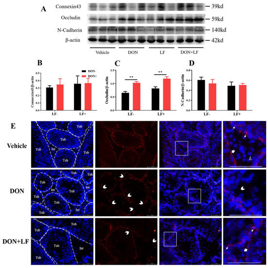 Effects of dietary DON and oral administration of LF on the expressions of BTB junction proteins. (A–D) Immunoblotting of connexin43, occludin, and N-cadherin protein expression normalized to β-actin levels and quantification of relative protein density. (E) Immunofluorescence staining of N-cadherin protein expression. The dashed lines separate the seminiferous tubules (Tub) from the interstitial tissue (Int). The white arrows indicate N-cadherin-positive staining between the spermatids and Sertoli cells. The bold arrows indicate N-cadherin-positive staining at the basement of the spermatogenesis tubules and the white empty arrowhead indicates the N-cadherin-negative Leydig cell. The open arrowheads indicate missing N-cadherin-positive staining sites between Sertoli cells and spermatids in the tubules. Data were presented as mean ± SEM. For one-way ANOVA, ** p < 0.01.