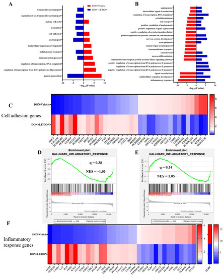 Transcriptional profiling of testes from mice, with diet supplementation of DON and LF. Gene ontology (GO) analysis of the up-regulated genes of the DON group compared to those of the vehicle group coupled with down-regulated genes of the DON + LF group compared to those of the DON group (A) and down-regulated genes of the DON group compared to those of the vehicle group coupled with up-regulated genes of DON + LF group compared to those of the DON group (B). Hypergeometric testing and Benjamini–Hochberg p value correction were applied. Heatmap of mRNA expression (RNA-seq) changes of the cell adhesion genes (C) and inflammatory response genes (F) in the testes of DON and LF-treated mice. (D,E) GSEA plots depicting the enrichment of genes involved in the inflammatory response of testes from DON-treated mice compared to the vehicles and DON-LF co-treated mice compared to the DON-treated mice. NES, normalized enrichment score; q value indicates false discovery rate p value (same for Figure 6).