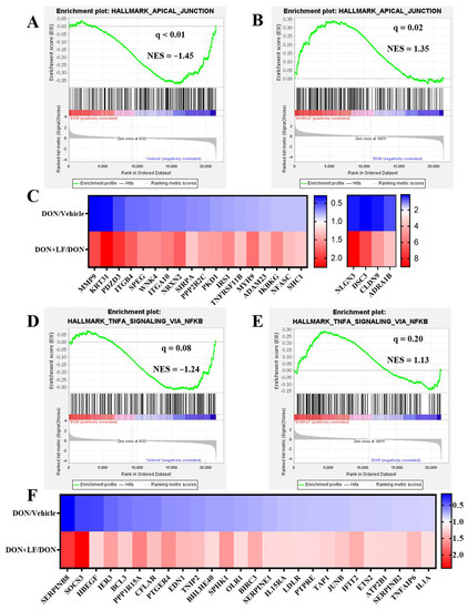 The GSEA plots indicated down-regulated gene expressions involved in apical junction and TNFα signaling via NFκB of testes in the DON group compared to the vehicle and normalizing effects of LF in the DON + LF group compared to the DON group. (A,B) GSEA plots depicting the enrichment of genes involved in apical junction that were down-regulated in the testes of DON-treated mice compared to the vehicle and up-regulated in the testes of DON-LF co-treated mice compared to those in the DON group. (C,F) Heatmap of mRNA expression (RNA-seq) changes of the apical junction and TNFα signaling via NFκB genes in the testes of DON and LF treated mice (log2 transformed, normalized to vehicle for DON group, and normalized to DON group for DON + LF group). (D,E) GSEA plots depicting the enrichment of genes involved in TNFα signaling via NFκB genes that were down-regulated in the testes of DON-treated mice compared to the vehicle and up-regulated in the testes of DON-LF co-treated mice compared to those in the DON group.