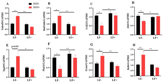 The mRNA transcriptional levels of inflammatory response and cell adhesion genes, including Rnf144b, Ccl22, Abi1, Itga9, Pkd1, IL6st and Relb, were further validated by qRT-PCR analysis (Figure 7). Dietary DON significantly increased Tnfrsf9, Rnf144b, Itga9, IL6st and Relb gene expressions, which were normalized by LF administration in DON + LF group (Figure 7A,B,E,G,H). Meanwhile, expressions of Ccl22, Abi1 and Pkd1 were significantly reduced in the DON group compared to the vehicle and these declines were improved to the comparable levels of vehicle by LF in DON + LF group (Figure 7C,D,F).