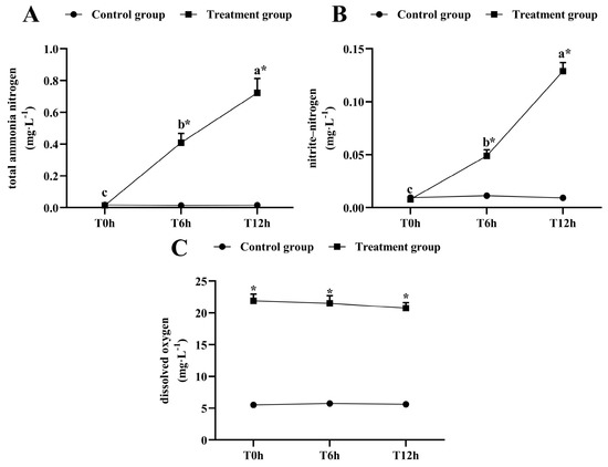 The total ammonia-nitrogen and nitrite-nitrogen concentrations increased significantly as the transportation time increased (p < 0.05, Figure 1A,B). After 12 h of transportation, the total ammonia-nitrogen concentration reached 0.723 ± 0.009 mg/L, which was significantly higher than that of its control group (0.0163 ± 0.002 mg/L), and the nitrite-nitrogen concentration was 0.129 ± 0.008 mg/L, which was significantly higher than that of its control group (0.009 ± 0.002 mg/L). The dissolved oxygen was kept above 20 mg/L during transport (Figure 1C).
