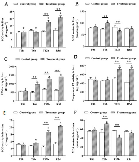 Antioxidant- and immune-related physiological parameters in the livers and intestines of juvenile largemouth bass under transport stress. Superoxide dismutase, SOD; malondialdehyde, MDA; lysozyme, LZM (A) liver SOD; (B) liver MDA; (C) liver LZM; (D) liver complement C3; (E) intestinal SOD; (F) intestinal MDA. T0h: transport stress at 0 h; T6h: transport stress at 6 h; T12h: transport stress at 12 h; R5d: recovery for 5 d. **: significant difference between the control and treatment groups (paired samples t-test, **: p < 0.01). Lowercase letters indicate significant differences (p < 0.05) between treatments (Duncan’s multiple-range test).