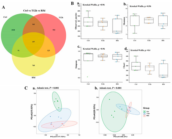 (A) Common and unique operational taxonomic units (OTUs) displayed by Venn diagram in the control, 12 h transport and recovery groups. The overlap indicates shared OTUs (B) and alpha and beta diversity of the gut microbiomes of juvenile largemouth bass under transport stress. Measures of alpha diversity included: (a) Observed species; (b) Shannon index; (c) Simpson index; (d) Chao1 index. (C) Beta diversity analysis based on principal coordinates analysis of unweighted UniFrac (a) and weighted UniFrac (b) distances. Ctrl: control group; T12h: transport stress for 12 h; R5d: recovery for 5 d.