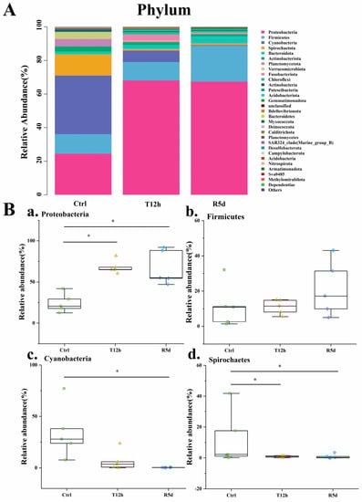 (A) Relative abundances of dominant phylum-level taxa in the control (Ctrl), 12 h transport (T12h) and recovery (R5d) groups. Species with lower abundances were classified as “others”. (B) Relative abundances of the dominant phylum-level bacteria (a–d) in the Ctrl, T12h and R5d groups. * significant difference between the control and treatment groups (Kruskal-Wallis H test, *: p < 0.05).