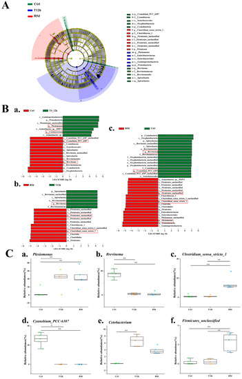Linear discriminant analysis results (Figure 6A,B) showed significant differences in the abundances of Plesiomonas, Cyanobium_PCC_6307, Firmicutes_unclassified, Brevinema Clostridium_sensu_stricto_1 and Cetobacterium. The Plesiomonas abundance increased significantly after transport stress, and was maintained in the recovery group (Figure 6(Ca)). The relative abundances of Cyanobium_PCC_6307 and Brevinema were significantly higher in the control group than in the 12 h transport stress and 5 d recovery groups (Figure 6(Cb,Cd); p < 0.05). The relative abundances of Clostridium_sensu_stricto_1 and Firmicutes_unclassified were significantly higher in the 5 d recovery group than in the control and 12 h transport groups (Figure 6(Cc,Cf); p < 0.05). The relative abundance of Cetobacterium was significantly higher in the 12 h transport group than in the control group but was similar to that of the recovery group (Figure 6(Ce)).