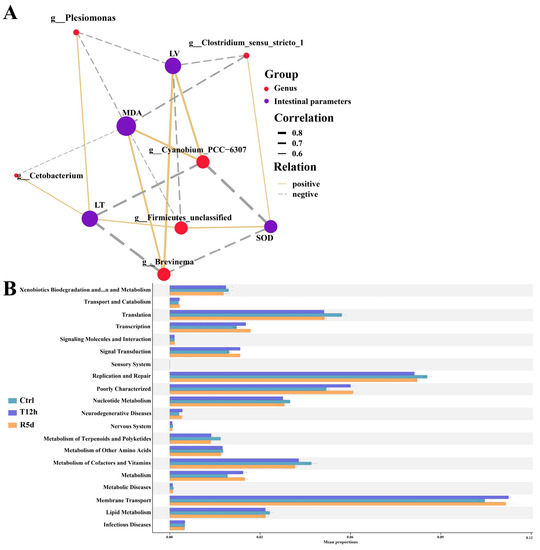 (A) Correlation network showing connections between gut microbial genera and intestinal parameters. Line thickness indicates the magnitude of the correlation. LV: intestinal villus length; LT: muscular thickness. (B) Functional analysis of the gut microbiota predicted at Level 2 for the control, 12 h transport and recovery groups.