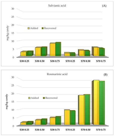 The concentrations of salvianic and rosmarinic acids determined in jelly candies (mg/kg candy) were similar to those used for candy formulation. Raw candies were formulated with 2.8–8.3 (SE38) and 1.9–5.7 mg/kg (SE70) of salvianic acid, while concentrations of this acid in the final product were 2.9–8.7 (S38) and 1.9–5.9 mg/kg (SE70) (Figure 1A). Raw candies were formulated with 1.5–4.6 (SE38) and 9.6–28.9 mg/kg (SE70) of rosmarinic acid, while concentrations of this acid in the final product were 1.7–5.0 (SE38) and 9.1–28.3 mg/kg (SE70) (Figure 1B). Therefore, most of the added salvianic and rosmarinic acids remained in the final product without degrading.