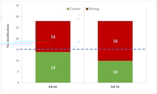 The contribution of both SEs to candy flavour was checked. In training sessions, SE flavour was described by the trained tasters as mild camomile and herbal, without bitterness or astringency. Both SEs showed a similar flavour to SE38. When compared with untreated candies in the triangular test (Figure 2), tasters correctly identified the flavour in 10 of 28 SE70 and 14 of 28 SE38 candy samples, respectively. According to the ISO Norm, 4120: 2004 [], at least 15 of 28 correct identifications are required to determine that flavour differences are significant for p < 0.05; therefore, no relevant differences in flavour were found between untreated and SE-enriched strawberry candies.