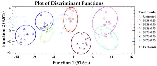 A discriminant analysis was performed to classify jelly candies according to their overall AC (Figure 3). The projections generated allowed a more intuitive identification of the different treatments. Five statistically significant discriminant functions were obtained (p < 0.05), with functions 1 and 2 explaining 97.1% of total variance. A clear separation was observed among untreated and SE-enriched candies, indicating the strong influence of SE on the AC values described above. A high overlap was seen between candies formulated with 0.25 and 0.75 g SE/kg, while those formulated with 0.50 g SE/kg showed a slight separation between the centroids. Thus, SE concentration played a more relevant role for candy AC than the SE used, confirming that both SEs provided similar antioxidant properties, despite their different composition.