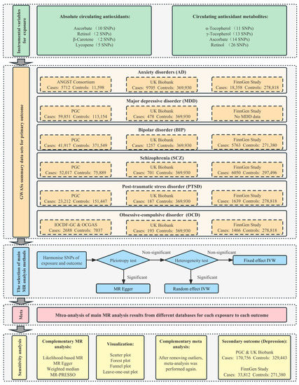 Therefore, in this study, we performed two-sample MR analyses to assess the causal associations between genetically determined diet-derived circulating antioxidant levels in the blood and six major mental disorders, including AD, MDD, BIP, SCZ, PTSD, and OCD.