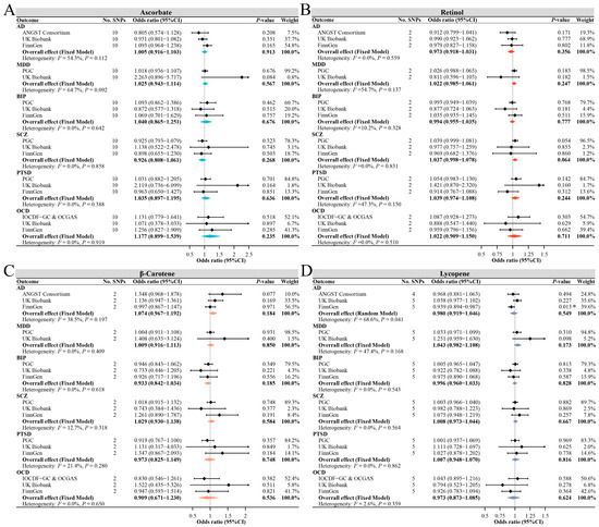 The main MR analysis results of the causal effects of four absolute circulating antioxidant levels on six major mental disorders. The ORs are scaled per µmol/L increase in ascorbate (A), per 0.1 unit increase in ln-transformed retinol (B), per unit increase in ln-transformed β-carotene (C), and per µg/dL increase in lycopene (D). The asterisk represents a suggestive association (0.001 < p-value < 0.05). Abbreviations: AD, anxiety disorders; MDD, major depressive disorder; BIP, bipolar disorder; SCZ, schizophrenia; PTSD, post-traumatic stress disorder; OCD, obsessive–compulsive disorder.