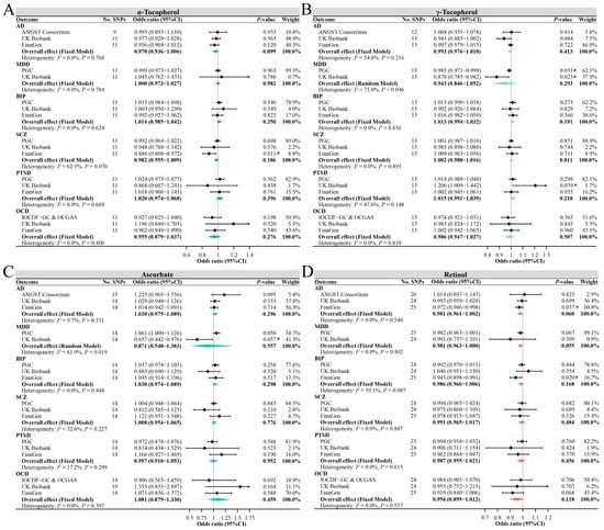 The main MR analysis results of the causal effects of four circulating antioxidant metabolites on six major mental disorders. The ORs are scaled per 0.1 unit increase in log-transformed α-tocopherol (A) and γ-tocopherol (B) and per unit increase in log-transformed ascorbate (C) and retinol (D). The asterisk represents a suggestive association (0.001 < p-value < 0.05). Abbreviations: AD, anxiety disorders; MDD, major depressive disorder; BIP, bipolar disorder; SCZ, schizophrenia; PTSD, post-traumatic stress disorder; OCD, obsessive–compulsive disorder.