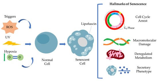 Senescent cells are defined by a general non-reversible cell cycle arrest, macromolecular damage, deregulated metabolism and secretory phenotype (SASP) [5,12]. This particular cell cycle withdrawal differs from the G0 phase and is mediated by p53/p21WAF1/CIP1 and p16INK4A/pRB tumor suppressor pathways. Many studies have already described that cell cycle arrest is transient [13]. Under specific conditions, senescent cells escape senescence, acquiring a proliferating and aggressive phenotype able to promote tumorigenesis. Macromolecular damage refers to DNA damage via telomere shortening, genomic instability, protein and lipid peroxidation damage involving ROS, resulting in macromolecular profile alterations, while mitochondria and lysosomes become less functional, leading to deregulated metabolism in general. Senescence-associated secretory phenotype (SASP) has a crucial role as a hallmark of senescence [5]. It consists of a broad spectrum of secreted molecules, including growth factors, cytokines, chemokines and matrix metalloproteinases, and this composition varies depending on the kind of stressor and also the cell type. Moreover, SASP is found to be involved in activation of the immune response, wound healing and tissue plasticity, and it is regulated by different signaling pathways, regulated by transcription factors such as C/EBPβ, NF-κB and GATA4. The interplay of senescent cells via SASP and tissue microenvironment in the context of pathology highlights the clinical aspect of senescent cells as a therapeutic target [12]. SASP mediates immune cell recruitment at the tumor site, but in addition, under a persistent and high intensity, the stressor signals can promote cancer immunosurveillance. The family of interleukins are major components of SASP, promoting tissue inflammation and injury following the MMPs’ activity in tissue remodeling, resulting in disrupted tissue homeostasis. Figure 1 summarizes the hallmarks of senescent cells.