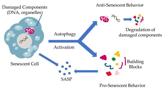 If the damage inflicted on the cell’s components is irreparable, the cell undergoes a transformation to a state of a generally permanent cell cycle arrest until the said issue is resolved, called senescence. The benefit of senescence is that, since the cell cannot further replicate, the damaged components cannot be passed on through cell division, which is the beneficial side of this process. On the other hand, senescent cells are disfigured, have faulty metabolism and secrete specific factors into their microenvironment, called the senescent-associated secretory phenotype (SASP), which can also promote senescence to their neighboring cells in a paracrine manner, which can ultimately even lead to inflammation and cancer [5,6]. This is where mechanisms such as autophagy are activated in order to contain the lesions and protect the cell from further damage. Autophagy can act chaotically, degrading cell components without specific guidance (macroautophagy), or in a more targeted manner, tracking down and eliminating only damaged components. Either way, this process has the purpose of eradicating the damaged factors in the cell and assisting in returning the cell to its normal state (anti-senescence) [7]. However, in the past years, a different and less studied version of autophagy’s nature has featured in the scientific community’s sights—a version through which autophagy sustains and promotes senescence through specific pathways but also through simply providing the building materials for SASP’s factors.