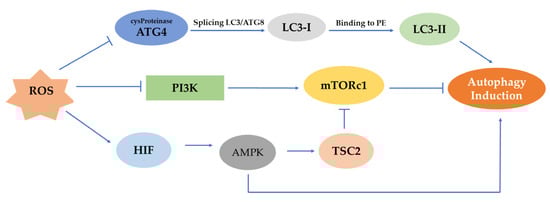 ROS can activate different pathways that can lead to the initiation of autophagy (Figure 3). In the first phase of autophagy, ROS may stimulate autophagy by controlling mTOR. The latter is a major negative mechanism of autophagy whose action is affected by multiple signaling pathways, such as the AMPK and PI3K serine/threonine-protein kinase (Akt) pathways [51]. Generally, in the procedure of autophagosome development, ROS can inhibit the operation of Atg4. More specifically, the Atg4 protease splices LC3/Atg8 to create cytoplasmic LC3-I. Then, LC3-I attaches to phosphatidylethanolamine (PE) by a process similar to ubiquitination involving Atg7 and Atg3 (corresponding to E1- and E2-like enzymes, respectively). The lipid version of LC3, sometimes referred to as LC3-II, adheres to the autophagosome membranes. mTOR is a significant regulator of growth factors and a nutrient-sensing kinase, which, along with AMPK, an energy-sensing kinase, regulates autophagy.