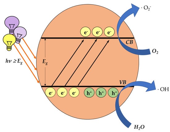 One of the main categories of nanomaterials, that of a semiconductor photocatalyst, focuses on inducing oxidative-stress-mediated cytotoxicity. The mechanism of photocatalysis is well studied. In brief, light carrying an appropriate amount of energy comes across the photocatalyst, overcoming the energy band gap Eg. Hence, the electrons lying on the valence band (VB) are excited and move to the conductivity band (CB), consequently leaving positive holes in the VB. These charges react with water (H2O) and O2 molecules around them, generating ROS (Figure 4).
