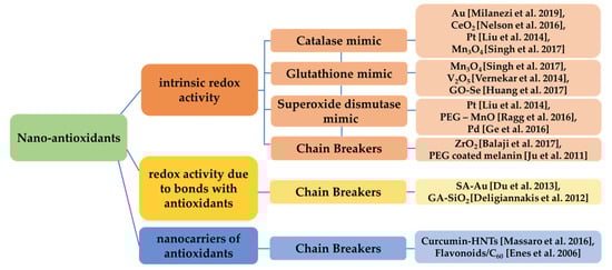 Categorization of nanomaterials acting as antioxidants based on their redox activity. Various nanomaterials present intrinsic redox activity (catalase-like, glutathione-like, superoxide dismutase-like, chain breaking) [87,92,94,95,96,97,98,99,100,101], redox activity related to bonds of the nanomaterial with other antioxidants [102,103] and redox activity due to the fact that act as nanocarriers of antioxidants [104,105].