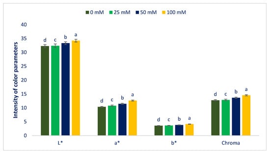 Color attributes of Lalshak as influenced by salt stress (n = 6). L* = Lightness; a* = Redness/greenness; b* = Yellowness/blueness. Dissimilar letters in the bars varied significantly by Duncan’s Multiple Range Test (DMRT) (p < 0.01).