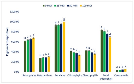 Pigments of Lalshak as influenced by salt stress (n = 6). Dissimilar letters in the bars varied significantly by DMRT (p < 0.01).