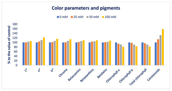 Figure 1 and Figure 2 represent the color parameters and pigments under different sodium chloride stresses. Preference, choice making, and acceptability of the product mostly depend on leaf color, which contributes significantly to the choice of consumers. It is a key indicator for evaluating the ARC of leafy vegetables [91]. The LS6 accession had high positive a* and b* values, indicating the presence of abundant red and yellow color pigments (betaxanthins, carotenoids, betacyanins, anthocyanins, and betalains). Our obtained results corroborated the results of Colonna et al. [91]. Betacyanins, chroma, L*, carotenoids, betaxanthins, betalains, a*, and b* values were progressively augmented in the order: Control < 25 < 50 < 100 mM salt stress. In contrast, total chlorophyll, chlorophyll b, and chlorophyll a content were drastically reduced in the order: Control > 25 > 50 > 100 mM salt stress. Carotenoids, L*, chroma, b*, betacyanins, betaxanthins, betalains, and a* were augmented by 14%, 0%, 1%, 1%, 2%, 4%, 1%, 4%; 28%, 32%, 3%, 7%, 7%, 6%, 5%, 3%, 11%; and 59%, 6%, 14%, 16%, 10% 10%, 8%, 22% under 25; 50; and 100 mM salt concentrations, respectively. In contrast, chlorophyll b, chlorophyll a, and total chlorophyll content were reduced by 2%, 6%, 4%; 9%, 9%, and 9%; and 17%, 19%, 18%, respectively, compared to control conditions (Figure 3). Petropoulos et al. [52] reported that the chlorophylls of Cichorium spinosum were drastically reduced with an increment in sodium chloride stress.