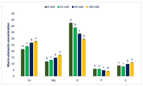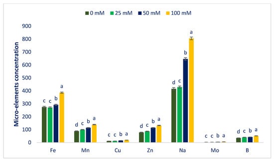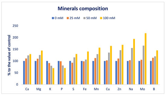In 25, 50, and 100 mM salt concentrations, calcium, magnesium, sulfur, iron, manganese, copper, zinc, sodium, molybdenum, and boron contents were increased by 11%, 10%, −7.5%, −1%, 13%, 3%, 10%, 3%, 5%, and 4%; 24%, 25%, 16%, 6%, 29%, 36%, 46% 55%, 66%, and 20%; and 30%, 44%, 30%, 40%, 57%, 64%, 69%, 94%, 18%, and 45%, respectively, compared to control conditions (Figure 6). In 25, 50, and 100 mM salt concentrations, potassium and phosphorus contents were reduced to 9%, 20%, and 30%, and 1%, 19%, and 30%, respectively, compared to control conditions (Figure 6).
